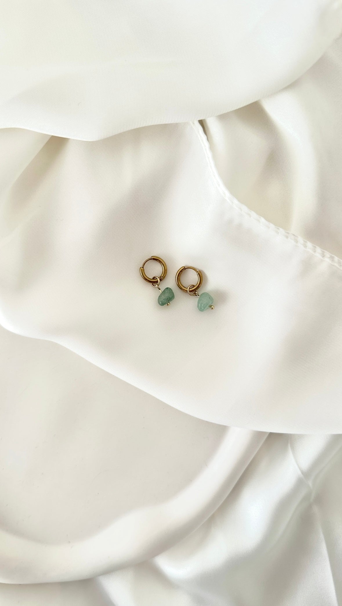 Minimalistisen kauniit korvakorut, joissa 18 karaatin kullalla PVD-pinnoitettuun kirurginteräsrenkaaseen on kiinnitetty vihreä aventuriinikivi.