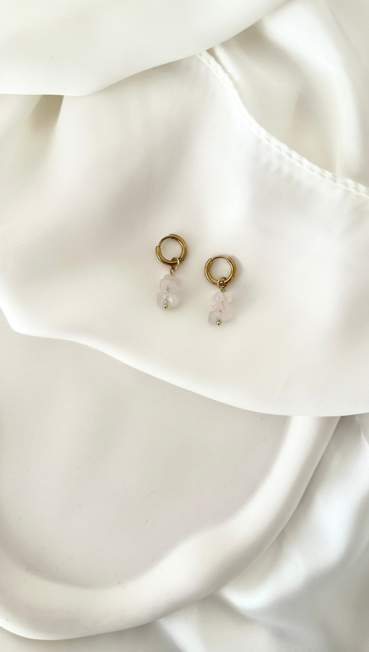 Sirot ja minimalistiset korvakorut, joissa 18 karaatin kullalla PVD-pinnoitettuun kirurginteräsrenkaaseen on kiinnitetty vaaleanpunaisia ruusukvartsinsiruja.