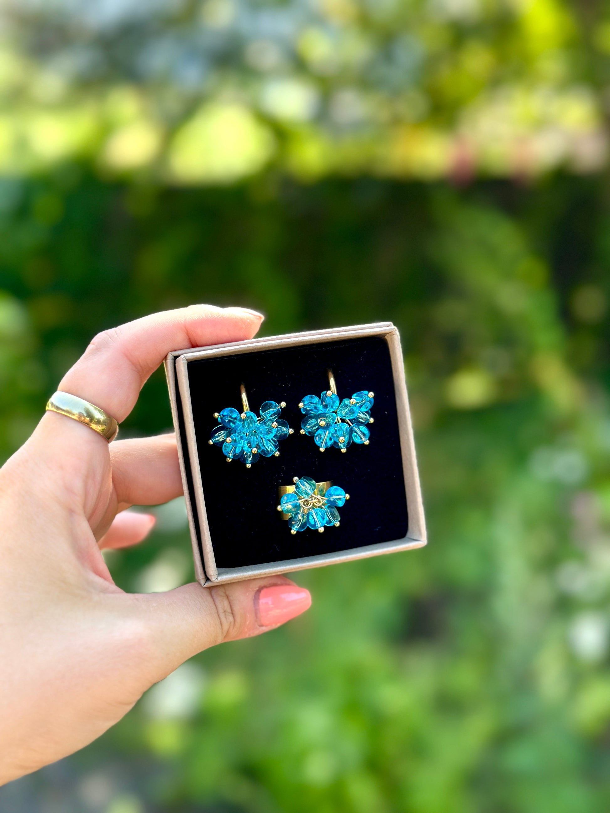 Setti sisältää korvakorut sekä sormuksen.