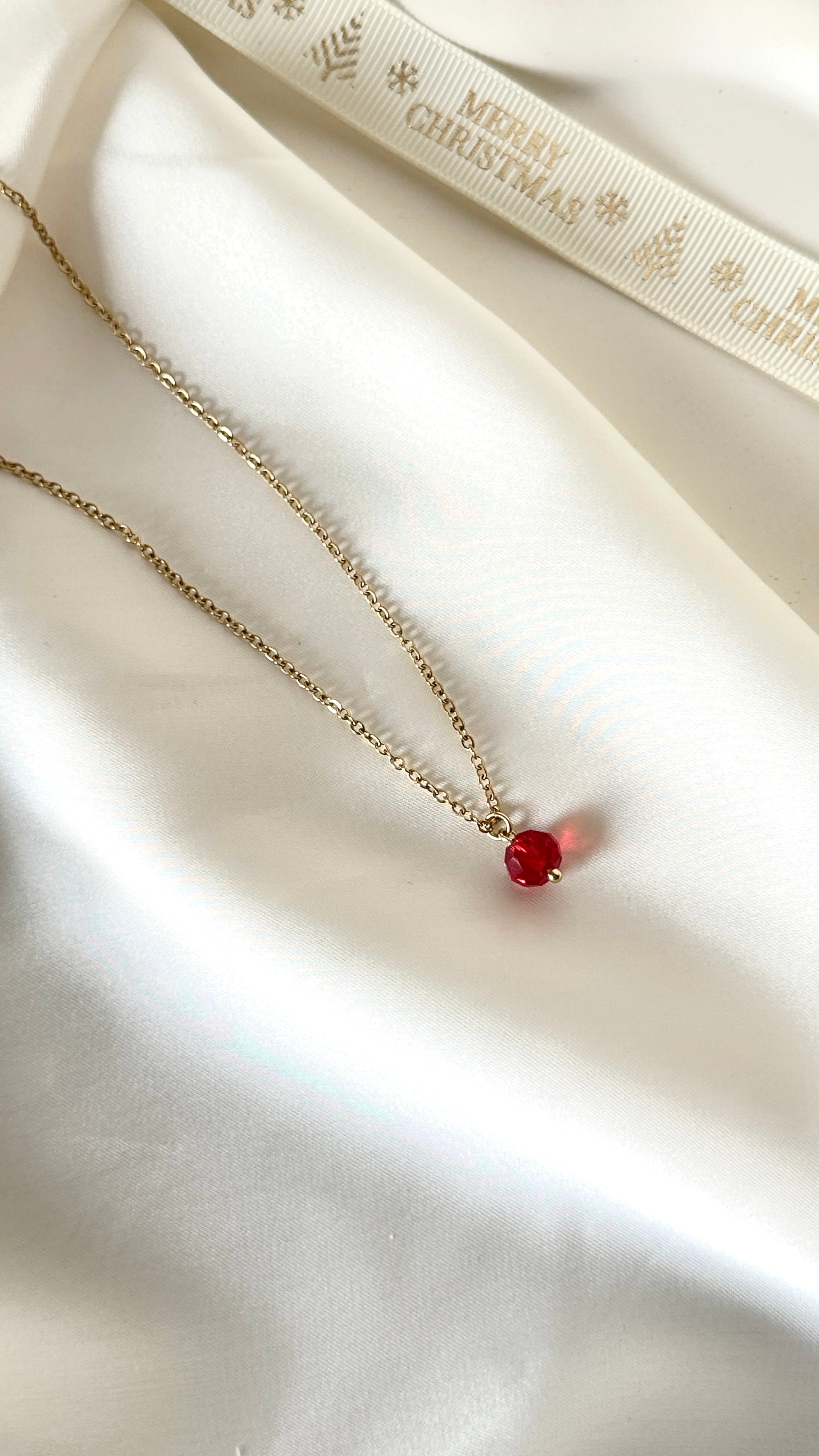 Lumo-kaulakoru on pieni ja herkkä väripilkahdus kaulalla – siro facet-hiottu kristallilasi heijastaa valoa kauniisti, mutta säilyttää minimalistisen ja hillityn ilmeen. Punainen kristalli tuo asuun pienen lämpimän sävyn, joka sopii täydellisesti talven juhlatunnelmaan, mutta toimii yhtä hyvin myös arkisena koruna.