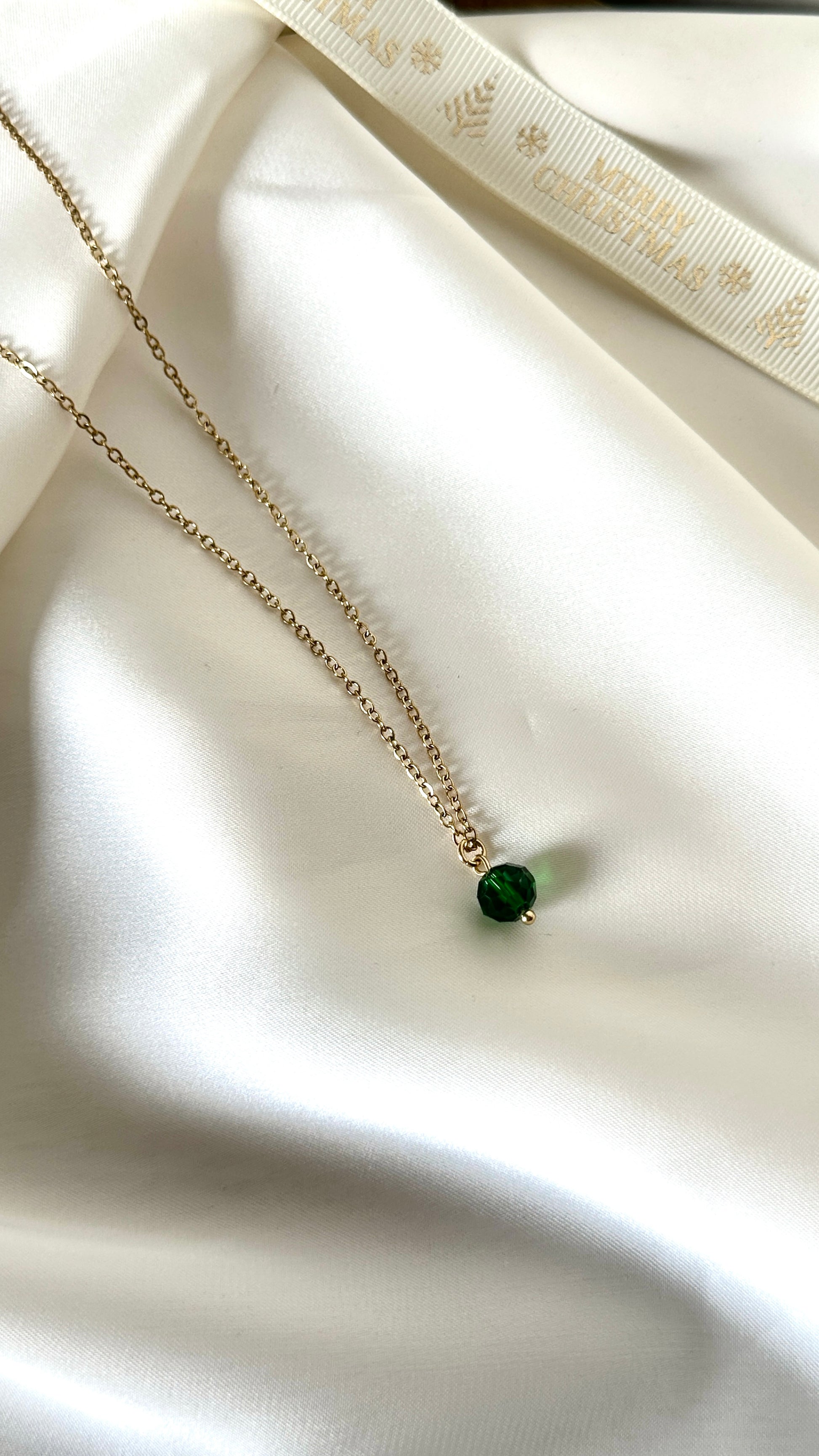 Lumo-kaulakoru on pieni ja herkkä väripilkahdus kaulalla – siro facet-hiottu kristallilasi heijastaa valoa kauniisti, mutta säilyttää minimalistisen ja hillityn ilmeen. Tummanvihreä kristalli tuo asuun pienen lämpimän sävyn, joka sopii täydellisesti talven juhlatunnelmaan, mutta toimii yhtä hyvin myös arkisena koruna.