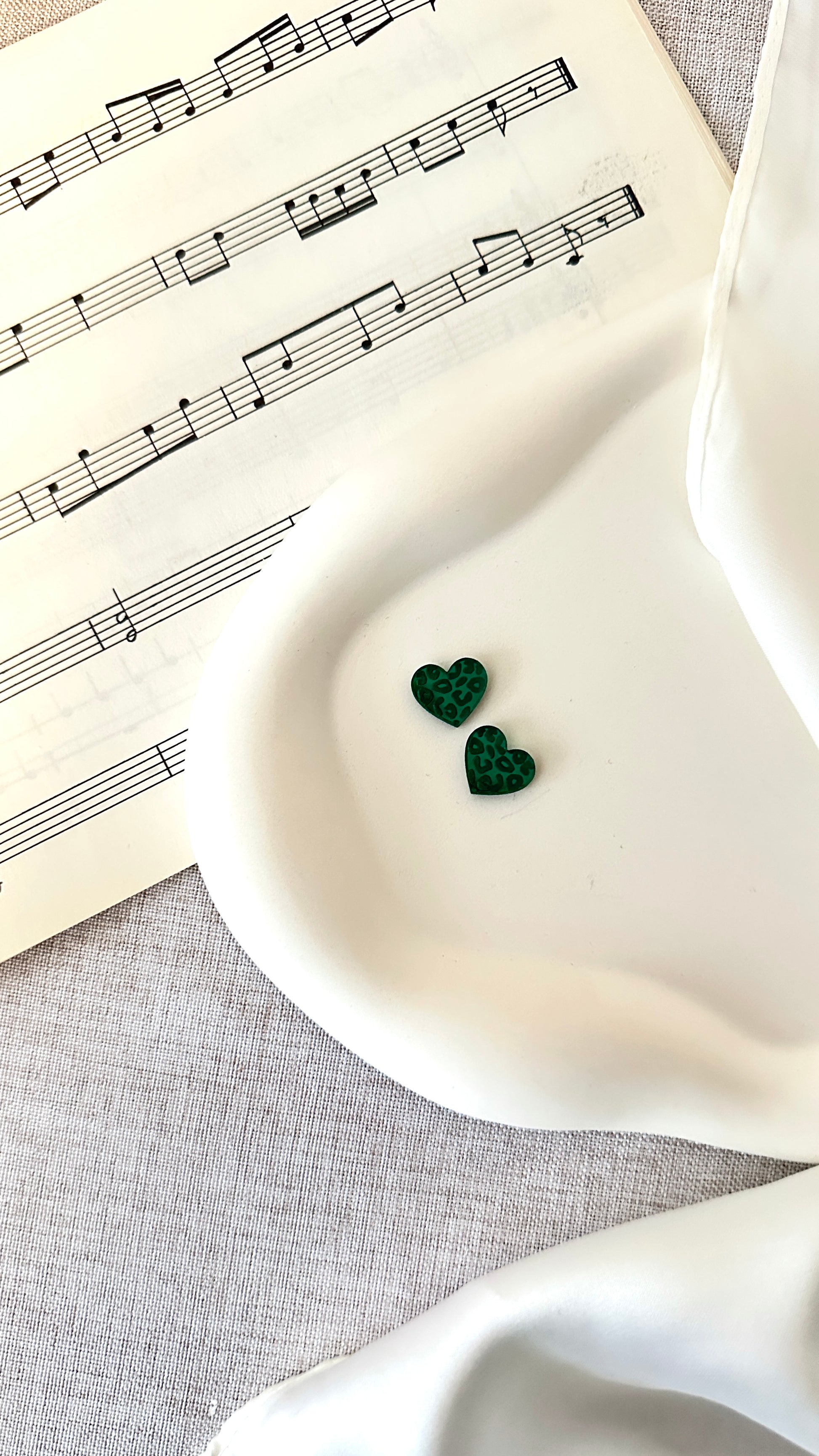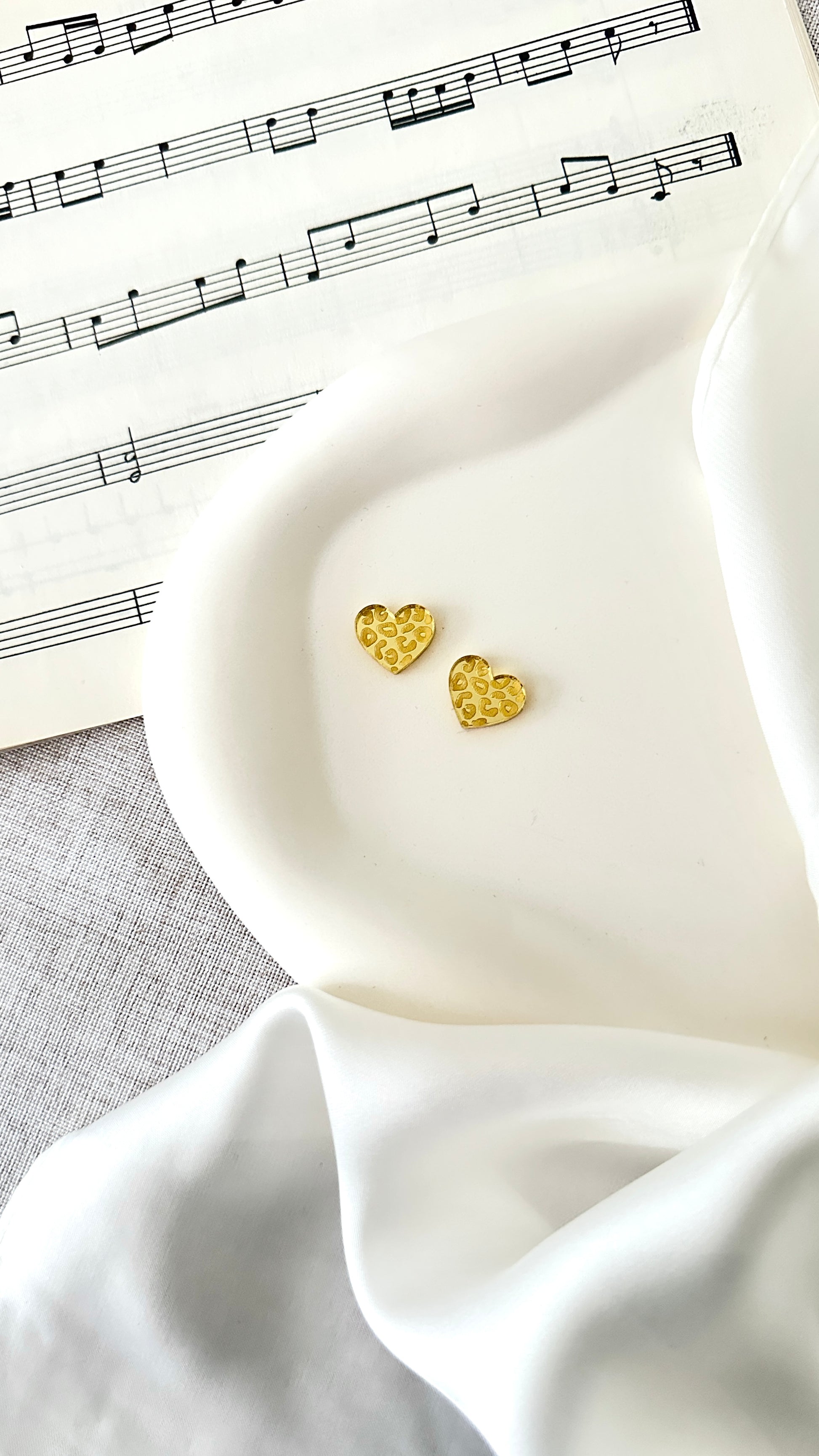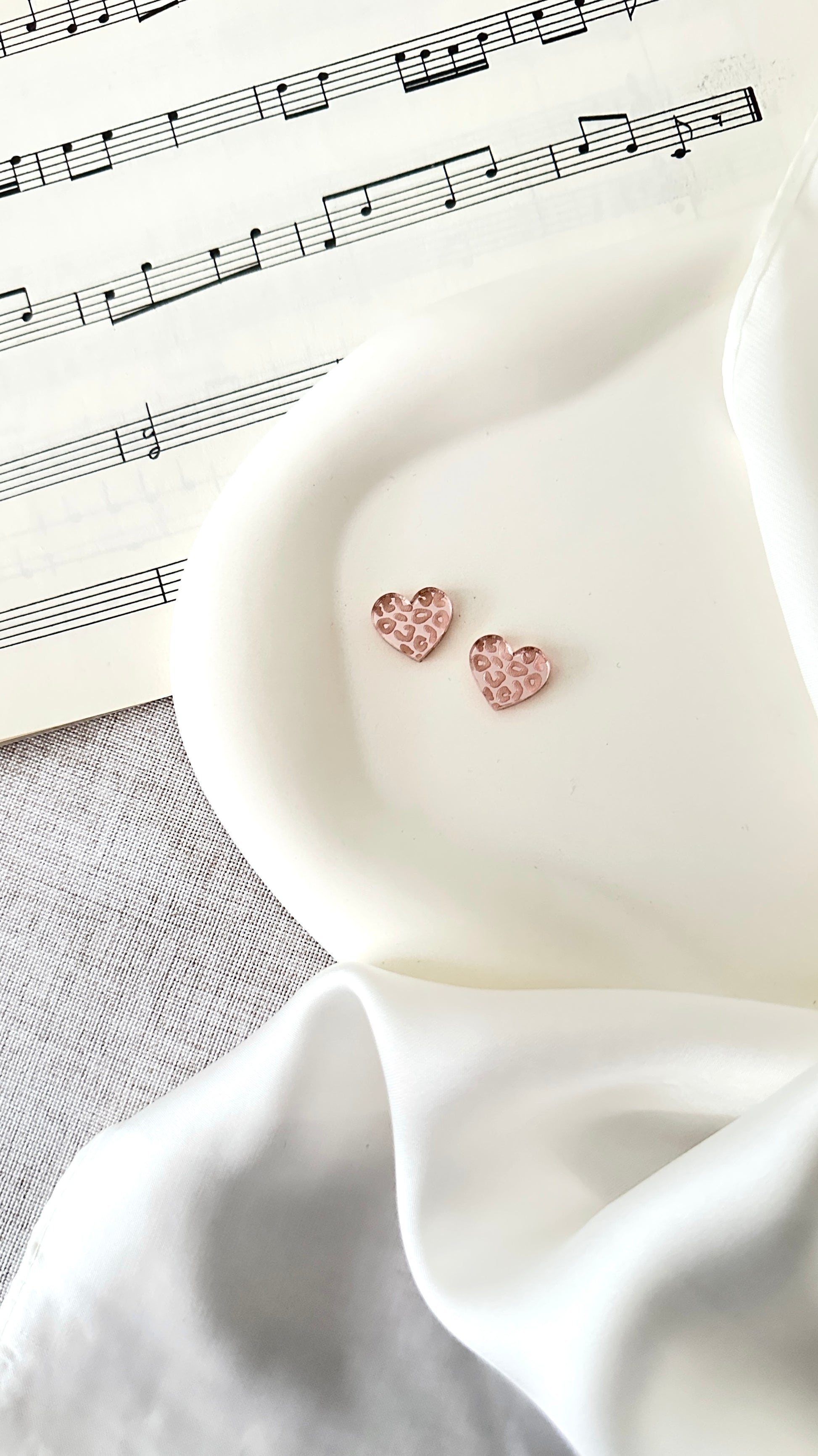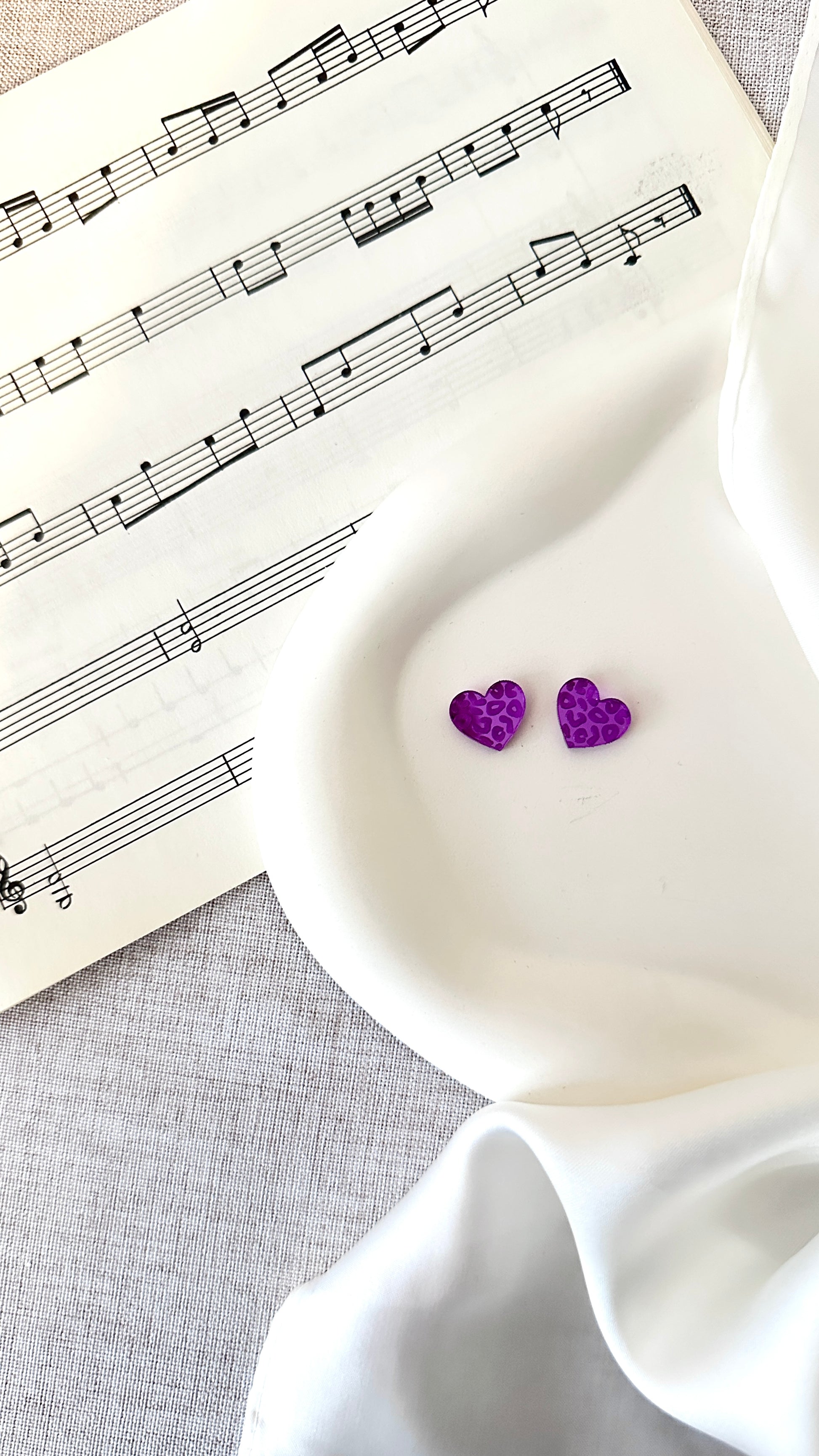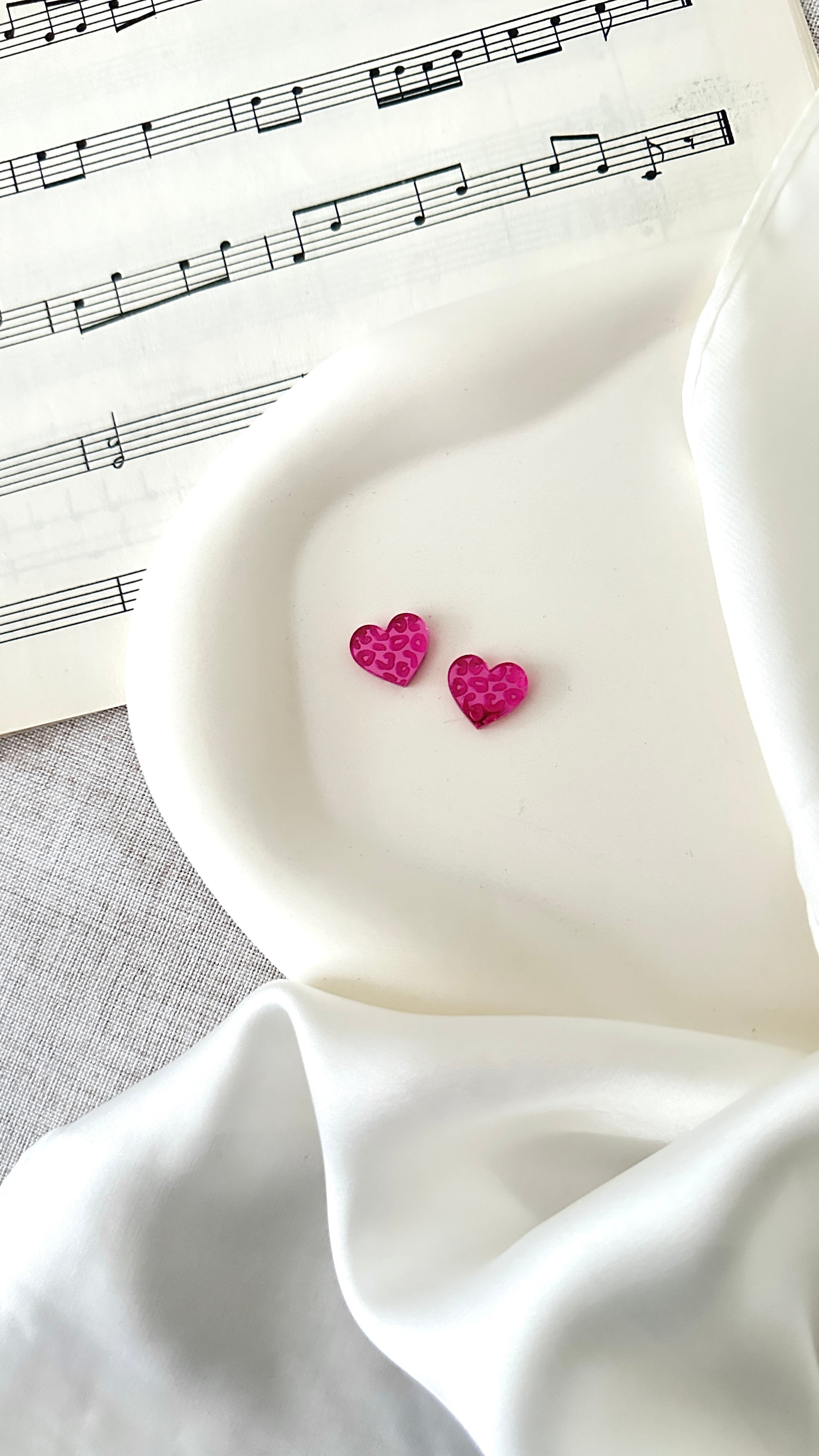 Pienet ja kevyet sydännappikorvakorut peilikiiltävästä akryylista, jossa moderni leopardikuvio. Useita värivaihtoehtoja saatavilla.