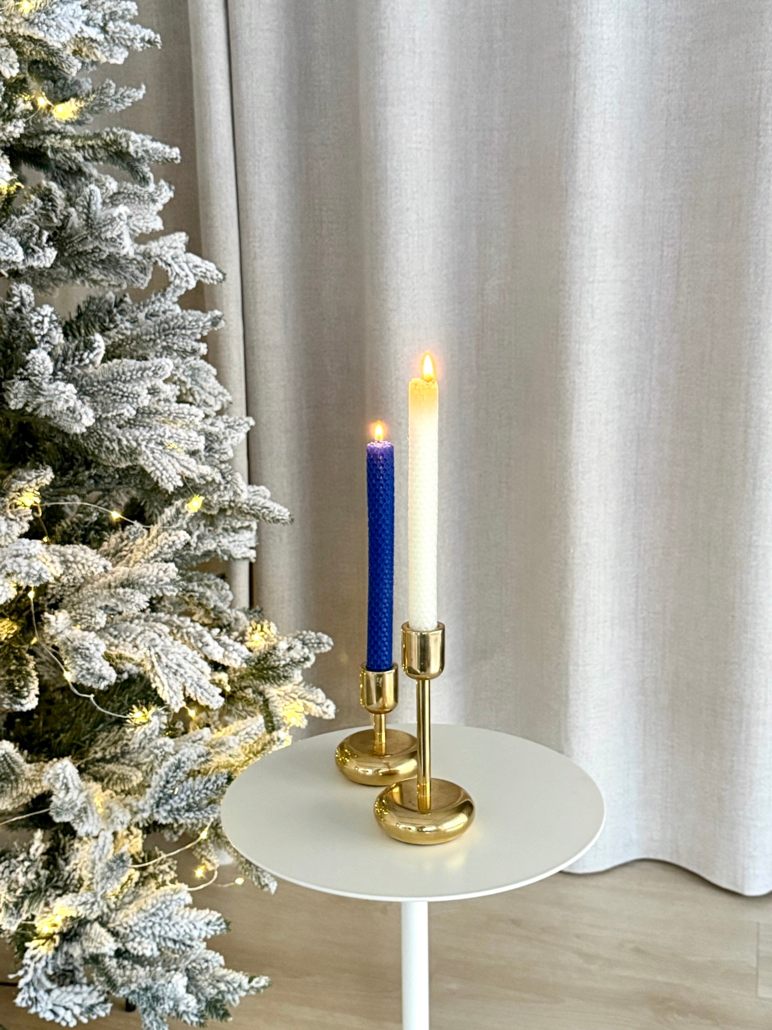 Tämä sinivalkoinen mehiläisvahakynttiläduo tuo kotiin juhlavuutta ja rauhallista tunnelmaa itsenäisyyspäivän illaksi. Sininen ja valkoinen kynttilä palavat puhtaasti ja kauniisti, levittäen lämmintä valoa ja hentoa mehiläisvahan tuoksua. Yhdessä kultaisen kynttilänjalan kanssa ne muodostavat tyylikkään ja arvokkaan kokonaisuuden – täydellisen lisän juhlapöytään, ikkunoille tai kynttiläasetelmiin.
