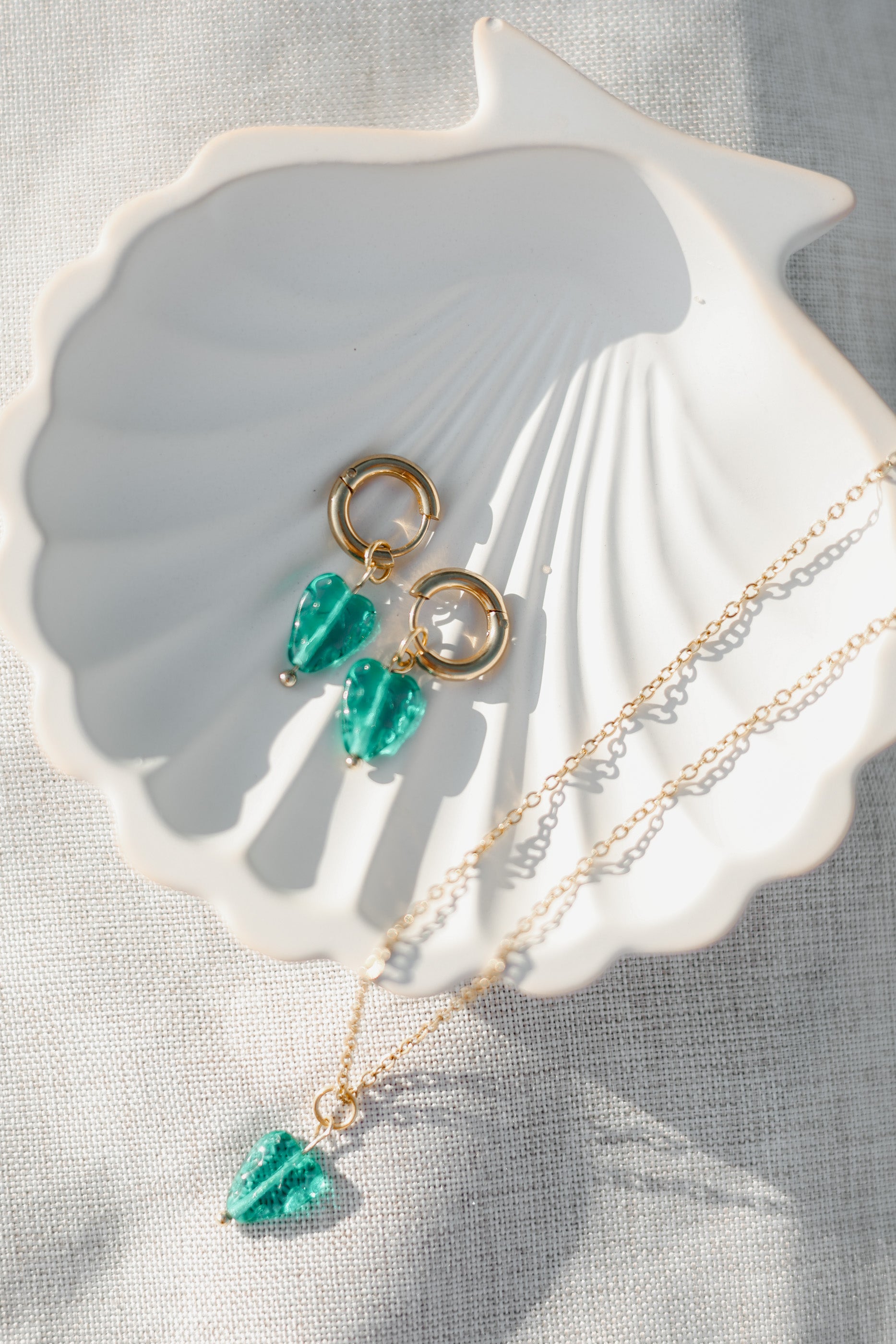 Vellamo-setissä on upeat merenvihreät sydänmuotoiset lasihelmet, jotka ovat lehtimäisellä urakuviolla. Setti on yksinkertainen ja näyttävä, joka tekeen sen täydelliseksi asusteeksi kaikkiin tilaisuuksiin.